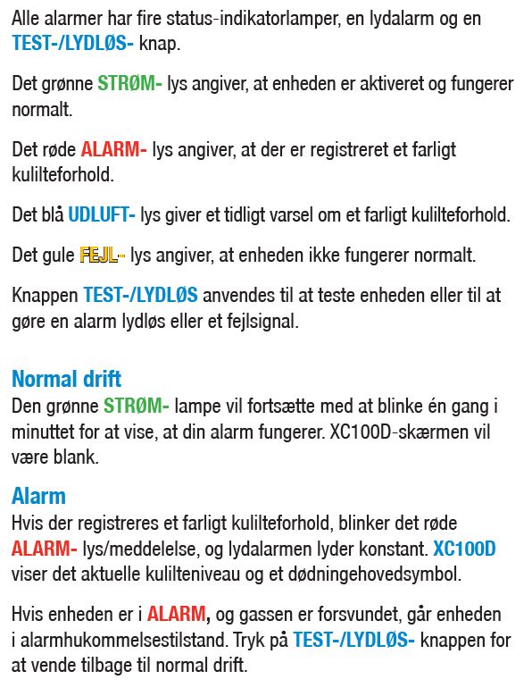 EN50291 definerer det kulilteniveau, hvor enheden skal og ikke skal gå i alarm. Jo højere kuliltekoncentrationen er, desto hurtigere udsender enheden en alarm. Det er baseret på, at kuliltens forgiftende virkning bestemmes af kuliltekoncentrationen og udsættelsestiden. Alarmpunkterne sikrer, at brugeren altid advares, når der opstår kritiske situationer. Alarmniveauerne er: 50 ppm: Alarm mellem 60 og 90 minutter 100 ppm: Alarm mellem 10 og 40 minutter 300 ppm: Alarm inden for 3 minutte