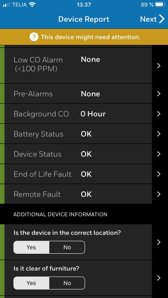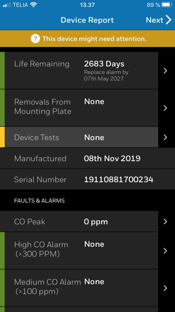 Når du trykker på den alarm som du ønsker rapport på, i dette tilfælde har vi kun en og vælger en som fremgår af registrerede alarmer. Nu kan du se alle informationer som bla. serienummer, batteristatus, alarmstatus i flere niveauer blot for nogle af de informationer og rapporter du kan se samt gemme eller printe ud.